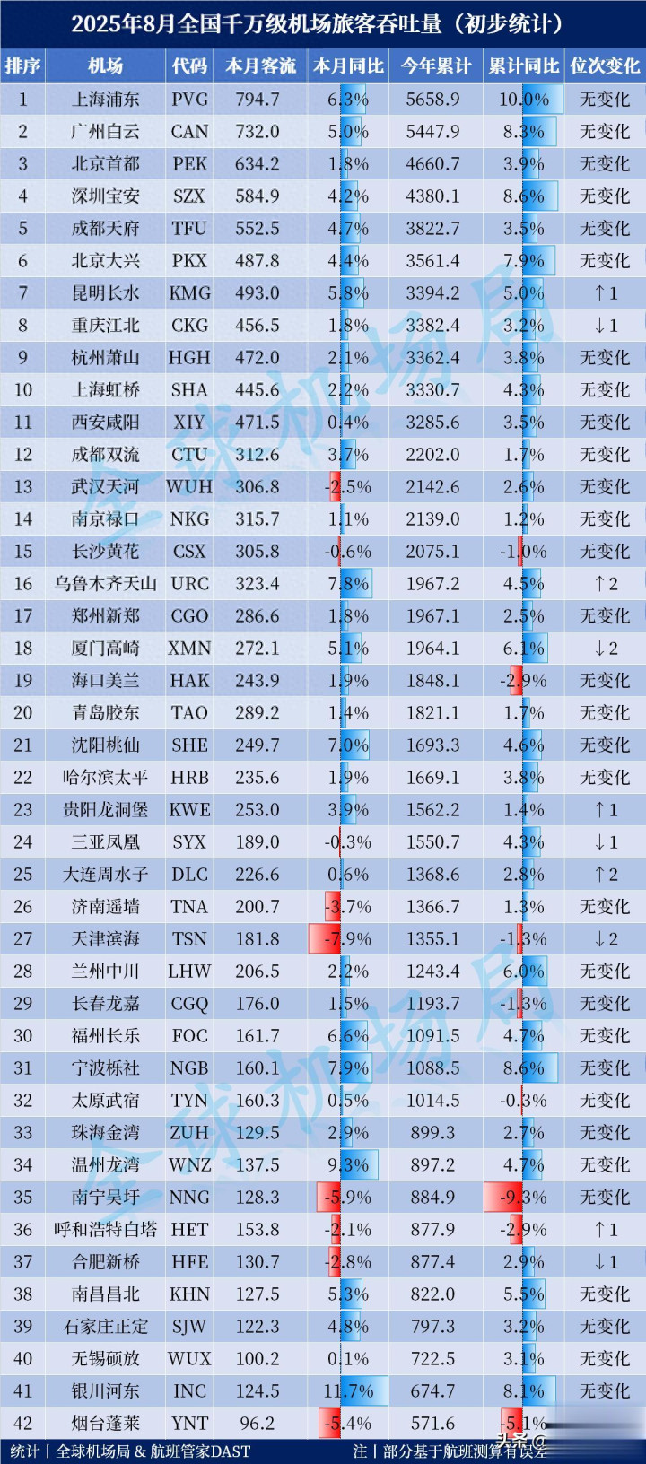 2025年8月全国千万级机场旅客吞吐量出炉(初步统计)!上海浦东机场以794.7万人次,拿下全国机场客流排名的首位,同比增长6.3%,广州白云机场以732万人次排在第二位,同比增长5.0%。从今年前8个月的累计旅客吞吐量情况来看,全国共计有2座机场已突破5000万人次,4座机场迈上了4000万人次,共计有11座机场旅客吞吐量在3000万人次以上,15座机场旅客吞吐量迈上2000万人次,32座机场旅客吞吐量达到千万人次以上。位次变化方面,本月昆明长水机场反超了重庆江北,排名升至全国第7位;乌鲁木齐天山机场上升2个位次,贵阳龙洞堡反超了三亚凤凰,大连周水子上升2个位次,呼和浩特白塔反超合肥新桥。[“初步统计”版为快报,仅供参考,部分基于测算有误差,更准确数值参考每月月底发布的“完整”版]